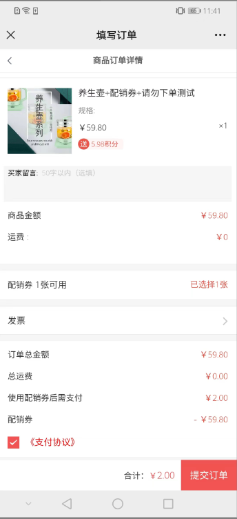 6、前端订单下单了(即提交订单未支付)就会显示配销券已使用,商城后台需要订单支付成功了才显示。订单关闭/订单退款关闭配销券会返还.