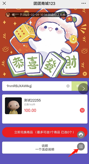 兑换飘窗:在兑换页面飘窗显示:[头像][昵称]于[时间]进行了兑换