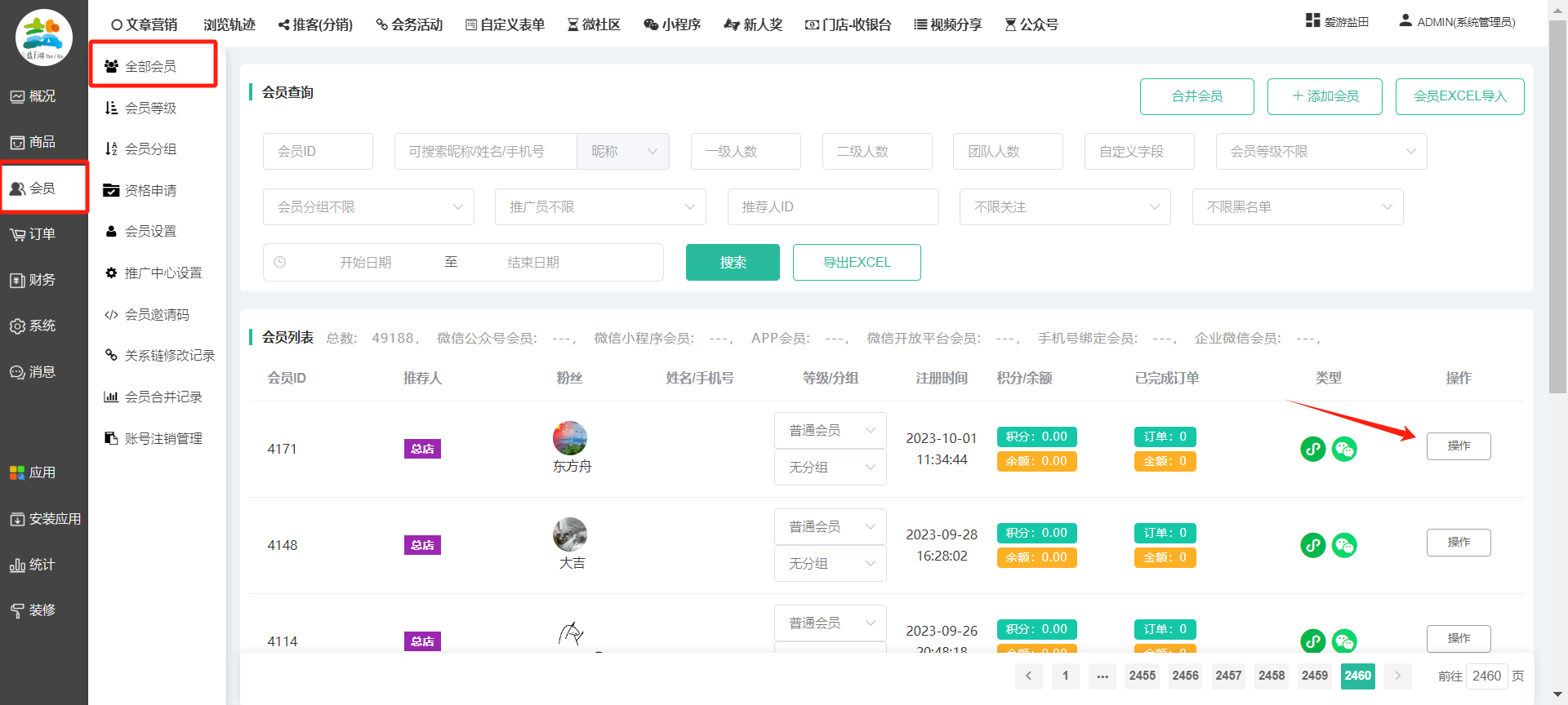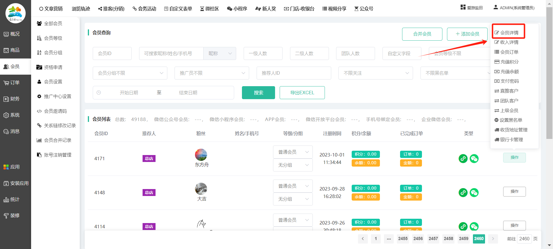 目录 搜索 展开 一、前期准备资料二、数字乡村码-上线操作指南1、服务号的申请流程及认证2、申请小程序流程3、开放平台绑定小程序和公众号三、数字乡村码-系统操作数字乡村码系统管理-概况数字乡村码-商品管理1、发布商品2、商品列表3、商品表单4、商品分类5、品牌管理6、配送模板7、评论管理8、优惠券管理9、商品标签10、退货地址设置11、满额优惠12、批量操作13、配送方式14、基础设置15、商品隐藏四、数字乡村码-会员管理1、全部会员2、会员等级3、会员分组4、资格申请5、会员设置6、推广中心设置7、会员邀请码8、会员关系链修改关系链修改记录9、会员合并记录10、账号注销管理11、会员设置中心五、数字乡村码-订单管理1、订单管理列表2、订单处理流程3、订单状态4、订单修改价格5、订单退款退货6、多包裹发货7、批量发货订单操作步骤8、催发货订单9、物流查询六、数字乡村码-财务管理1、余额设置2、会员余额3、充值记录4、转让记录5、余额明细6、收入明细7、提现设置8、提现统计9、积分管理10、转账审核11、收益广告12、批量充值七、数字乡村码-系统管理1、商城入口2、商城设置①、商城设置②、订单设置③、物流查询④、短信⑤、联系方式⑥、分类⑦、优惠券⑧、分享⑨、幻灯片⑩、广告位⑫、地图设置3、交易设置4、微信模板消息自定义消息模板(新版)自定义消息模板(旧版)小程序消息模板公众号模板消息变更公告5、语言设置6、权限管理7、多媒体管理八、数字乡村码-消息管理九、数字乡村码-应用管理十、数字乡村码系统-数据统计十一、数字乡村码-页面装修DIY1、模板管理2、店铺页面3、顶部导航4、底部导航5、DIY模板市场6、首屏广告7、基础设置8、装修DIY尺寸建议十二、供应商功能插件操作指南1、供应商2、门店-收银台门店申请和使用步骤门店管理①、门店-收银台 营销设置②、门店-收银台 分润设置门店分类门店申请门店审核门店商品门店商品订单收银台订单数据统计核销员基础设置默认设置门店装修3、微社区4、会务活动十三、营销插件操作指南活动报名提货卡新人奖微店问卷调查积分视频分享1、视频分享基础设置2、视频分享发现管理3、视频分享分类管理4、视频分享评论管理5、视频分享分红记录6、视频分享短视频中心每日红包幸运大抽奖签到优惠券二维码任务奖励优惠劵文章音频文章付费文章限时购新海报拓客卡操作流程积分活动素材中心视频红包十四、入驻门店应用类1、门店预约2、附近商品3、门店定位设置4、门店控制5、门店满额包邮6、门店满额减7、导入商品8、门店搜索9、门店股东10、核销券11、多门店核销1、商城后台设置2、前端功能演示十五、常见问题1、后台登录密码修改流程2、会员-余额,积分,后台如何进行充值与扣除3、如何修改上下级关系4、一种万能的获取商城小程序路径的方法 暂无相关搜索结果! 阅读次数:1584 本文档使用 模王系统 发布 8、会员关系链修改 8、会员关系链修改一.如何修改上下级关系?1.会员-全部会员-可以通过搜索用户的独立ID,或者用户微信昵称,找到此会员,然后点击右边的(操作)2.再点击会员详情。3.滑到下面,有个推广信息-会员上线,点击修改4.输入上级的ID号,点击搜索,出来此上级会员后点击选择。5.滑到最下面,一定要点击提交按钮。文档更新时间: 2023-11-30 14:56 作者:链上旅行
