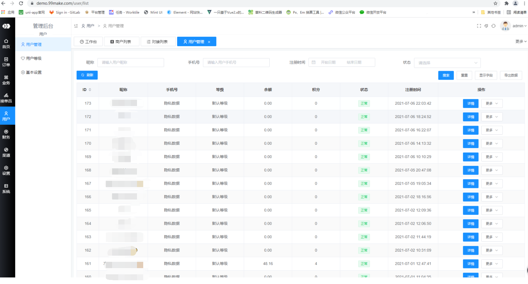 ①首先前往小程序授权登录,之后在跑腿后台-用户可以看到注册的用户信息。